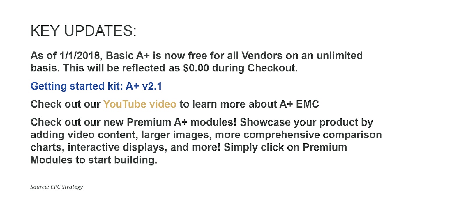 Since September of 2015, however, Amazon has been running a “limited-time” offer for Vendor Express users that gives them up to five free A+ EMC pages. This offer is only for qualifying products that aren’t already part of Amazon’s catalog.