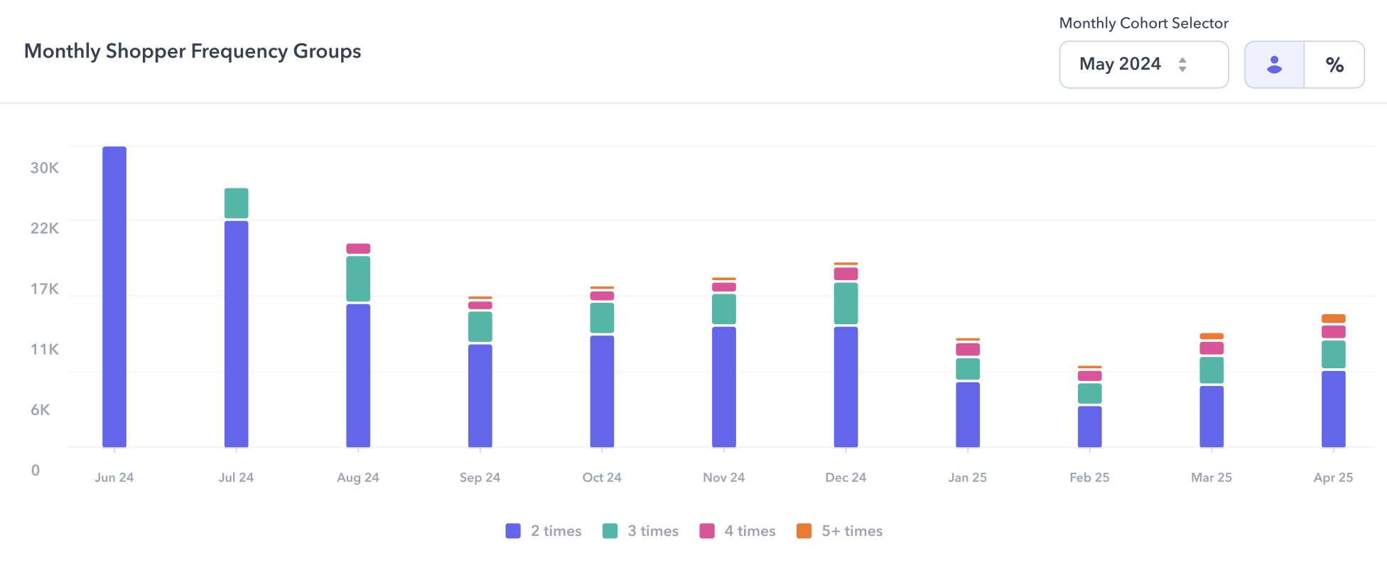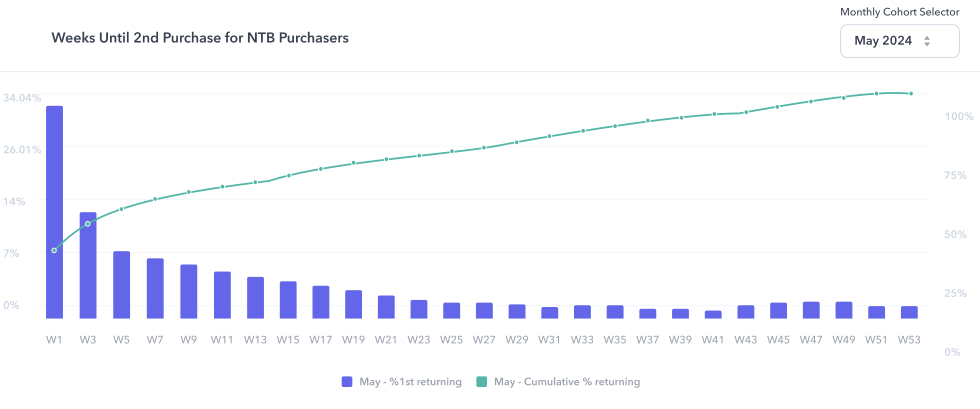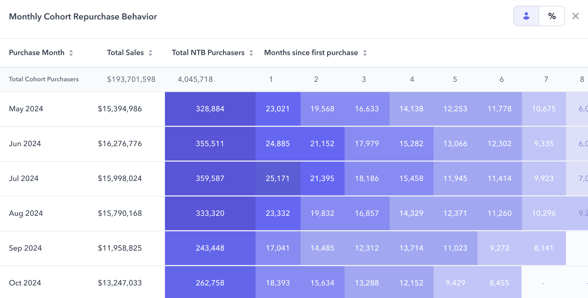 Similarly, the Monthly Cohort Repurchase Behavior report focuses on tracking the repurchase rates of NTB consumers across different cohorts. It highlights how many first-time buyers return for subsequent purchases, providing valuable insights into retention rates - helping you see how effectively you are in acquiring and turning first-time buyers into loyal, repeat purchasers.