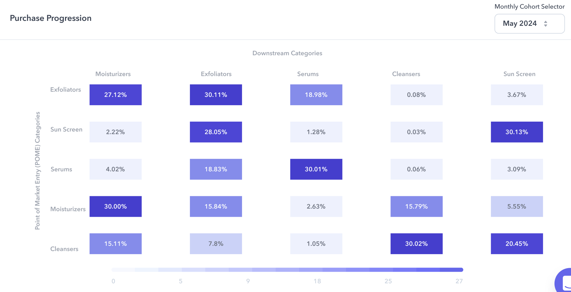 Last but not least, the Cross Purchase Progression Report tracks how consumers expand their relationship with your brand after their POME. By analyzing which categories shoppers return to over time, it reveals patterns in cross-category purchase behavior. These insights help identify prime opportunities for basket building, upselling, and developing more effective product journey strategies.