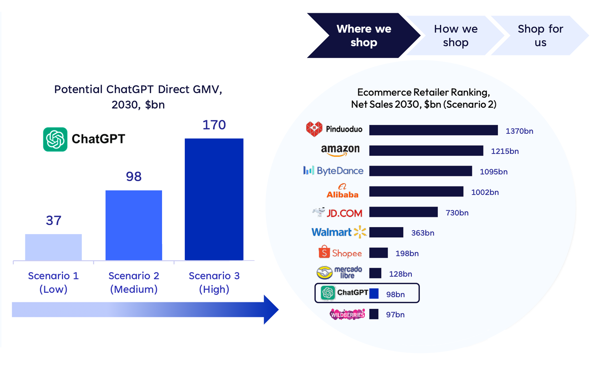 While it's impossible to fully predict the path of ChatGPT as a retailer, we see three distinct scenarios for ChatGPT’s rise, each telling a different story about just how much of the digital shelf it might claim, if it continues on it’s current trajectory and captures ~50% of Google’s current web traffic by 2030.