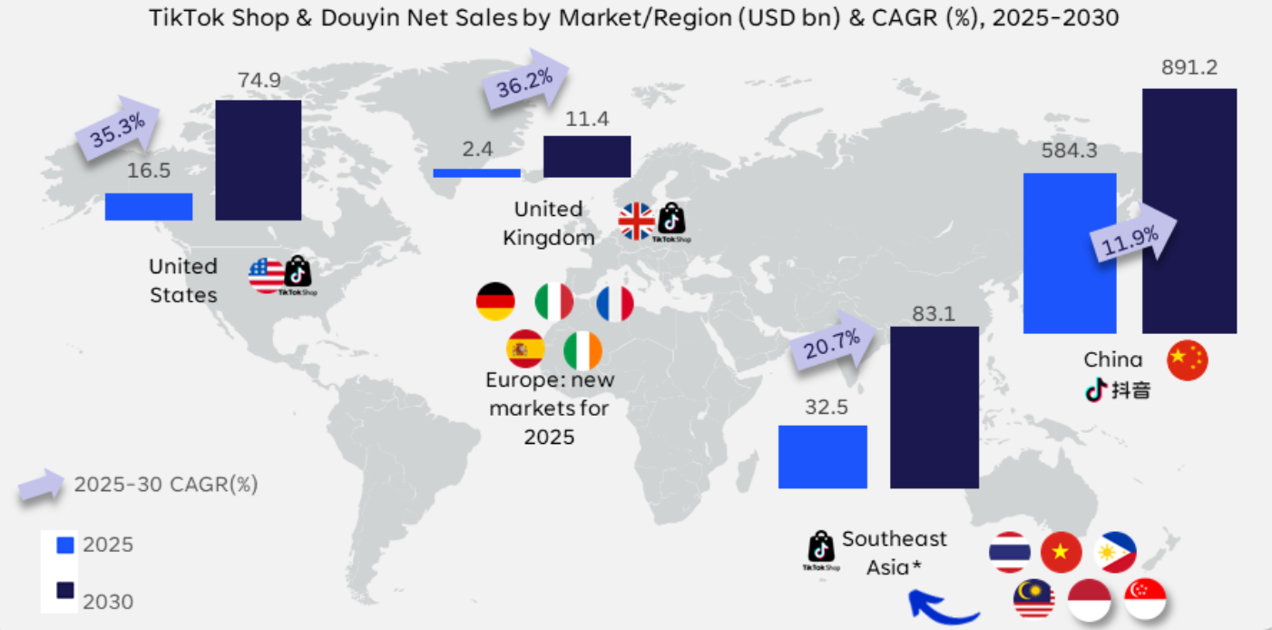 By 2030, TikTok Shop will be the 7th‑largest eCommerce retailer globally, while Douyin is projected to rank 4th.