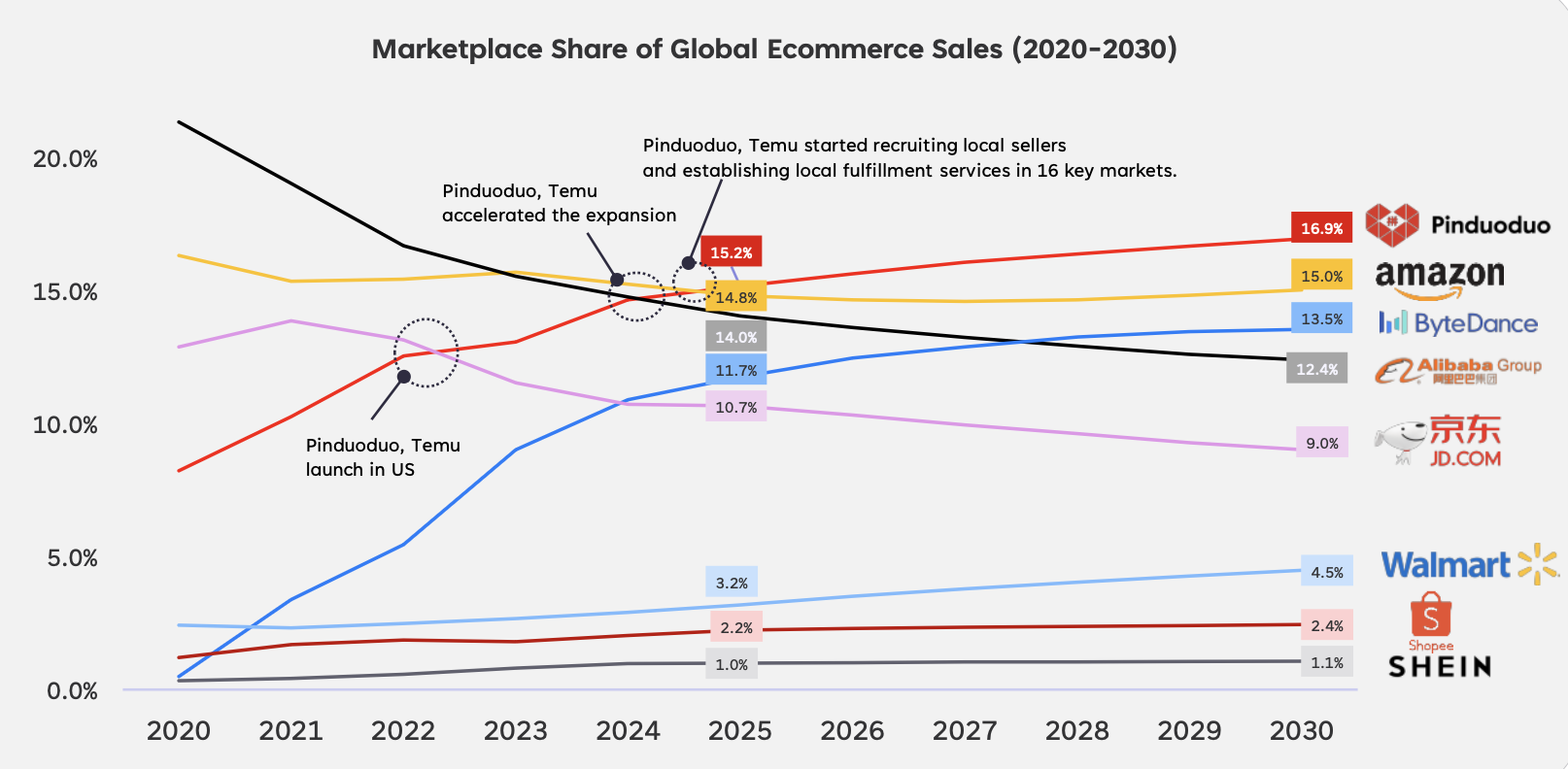 ByteDance’s market share of global eCommerce sales will be 14.6%, just trailing Amazon’s 15.9% by 2030.