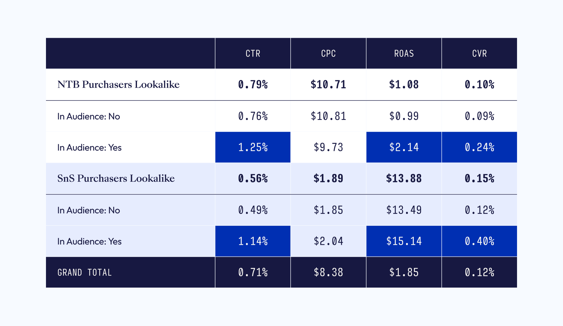 To increase NTB rates, we built an NTB Purchasers Lookalike AMC Audience for Sponsored Ads and applied it to non-branded and conquesting campaigns.