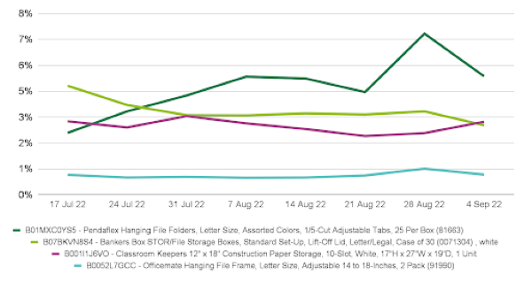 Over the past 12 weeks, no one brand had more than one listing in the top 5. Bankers Box had the top performing ASIN with its Standard File Storage boxes gaining a 4.21% share just 0.02% ahead of 2nd placed Pendaflex (4.19%).