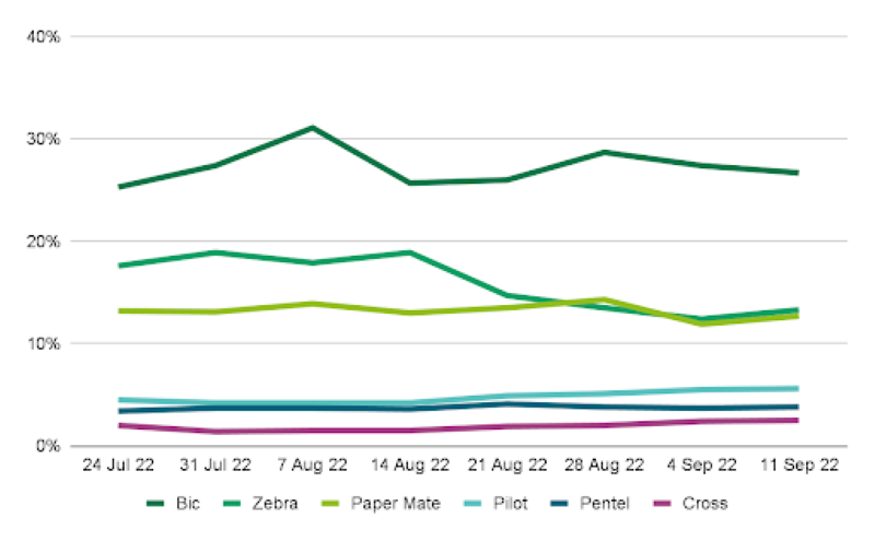Bic had the greatest average market share over the last 12 weeks, with a share of 29.0%. This was nearly double that of Zebra.