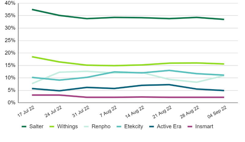 Over the past 8 weeks, Simple Houseware had the greatest share for all 8 weeks, however, it almost lost this spot to SAFCO on 7 August and Officemate on 28 August.